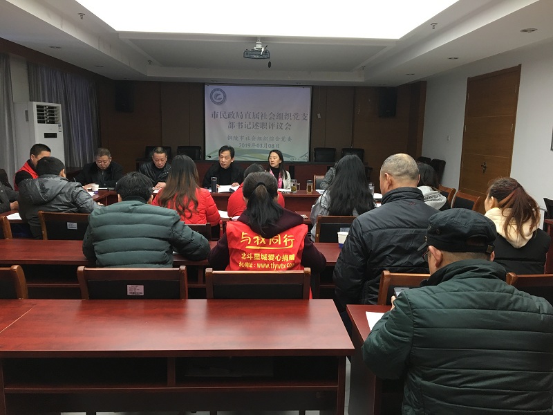 日前,铜陵市社会组织综合党委召开市民政局直属社会组织党组织书记抓基层党建工作述职评议会。市民政局党组成员、市社会组织综合党委书记杨宏斌主持会议,市社会组织综合党委委员、局属社会组织党支部书记,相关社会组织中“两代表一委员”及部分党员群众代表参加会议。
