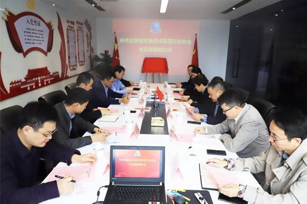 安徽省社会组织综合党委委员冯斌宣读了《关于成立安徽省安全技术防范行业协会党支部的批复》,并对协会党支部成立表示衷心祝贺。随后安徽省社会组织综合党委委员冯斌和安徽省安防协会党支部书记于利莉共同进行揭牌。