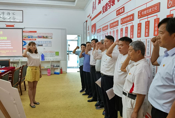 2020年7月1日下午,在中共安徽海轩教育支部会议室,在中共安徽徽博文化投资有限公司张娜书记的领誓下,九人同时右手高举,胸带党徽,面对党旗.发出了铮铮誓言.这是一场别开生面的党日活动.是四个支部的共同发声.这是一个共同欢庆的时刻,共建结对,实行红色联盟,以此为党庆生。