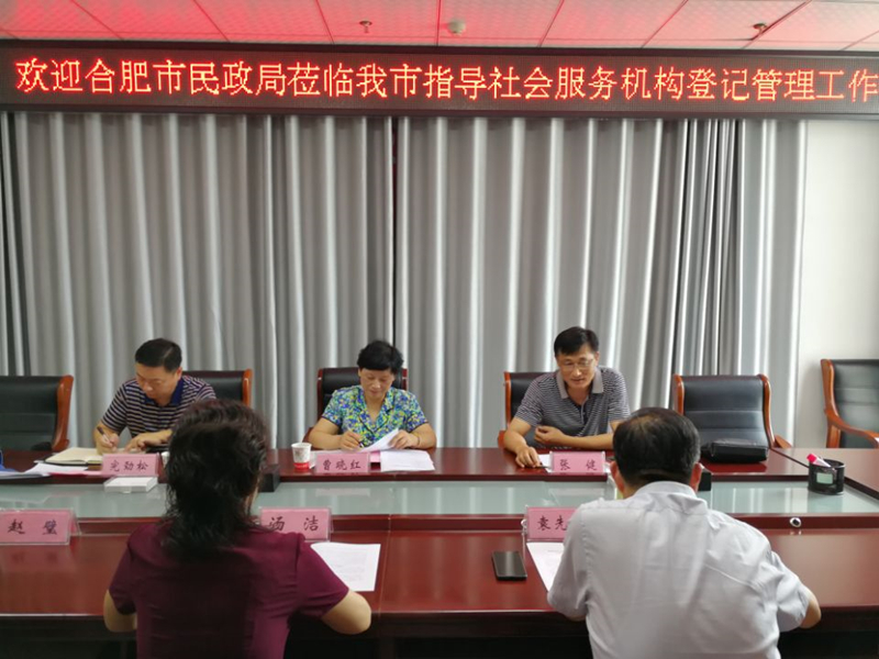 曹晓红副局长一行3人,通过听取汇报、查阅资料等方式,详细了解了我市社会服务机构基本情况及登记管理工作自查自纠情况,并对我市自查自纠工作进行相关指导。座谈会上,市民政局社会组织管理局局长赵璧汇报了我市社会服务机构管理工作自查自纠工作情况,合肥市民政局介绍了他们社会服务机构管理相关情况,大家就社会服务机构管理工作创新发展和社会组织培育壮大进行了深入交流。