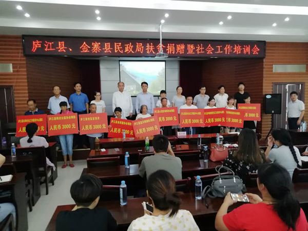 庐江县民政局组织11家社会组织赴金寨县开展扶贫结对帮扶捐赠活动。庐江县庐城镇绣溪卫生服务中心、庐江微创医院、庐江县溪水社会工作服务中心、庐江县黄梅戏迷协会、庐江县慈善协会、庐江县众和社会工作服务中心、庐江县心理咨询师协会、庐江县阳光公益协会、庐江县食用菌协会、庐江县蓝天救援队、庐江县青扬社会工作服务社等11家社会组织向金寨县10户贫困学生共计捐资5万元。
