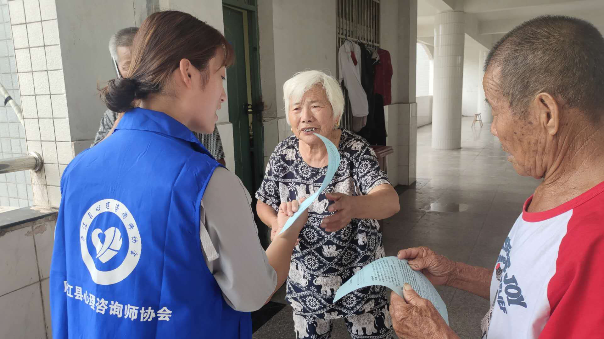 7月23日下午,庐江心理咨询师协会心理救灾志愿队员一行12人,在秘书长孙建、副会长伍淑丽带领下,来到汤池中学安置点,发放灾后心理疏导指南,进行心理需求调查,为转移安置圩区居民提供心理救助服务。