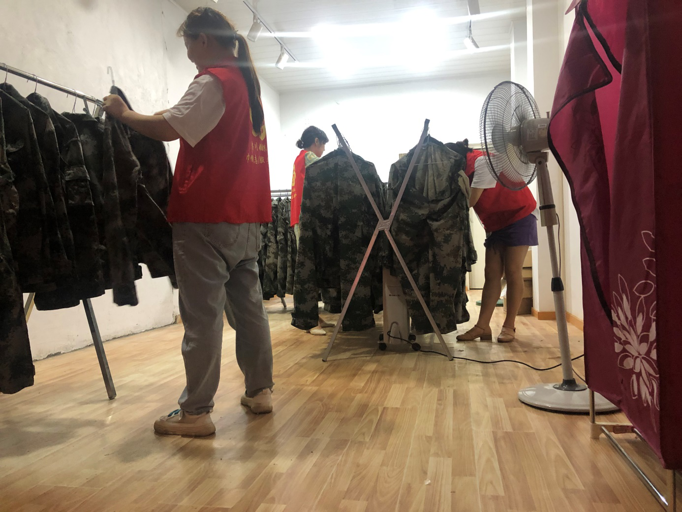 7月26日,庐江县壹点爱志愿团组织志愿者收集抗洪部队衣服送往干洗店,并帮助清洗衣服。