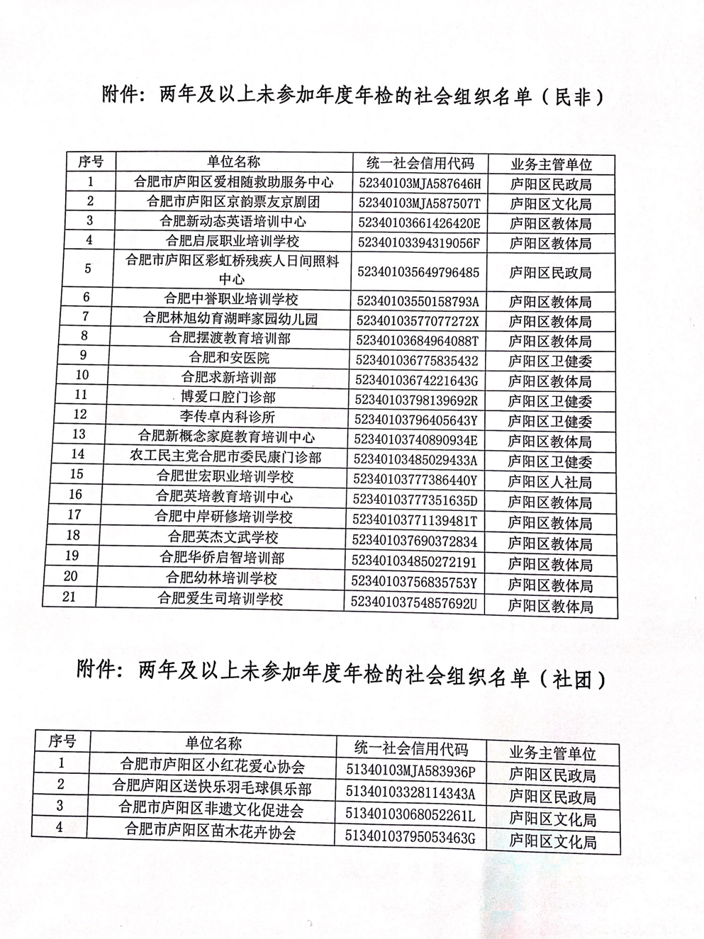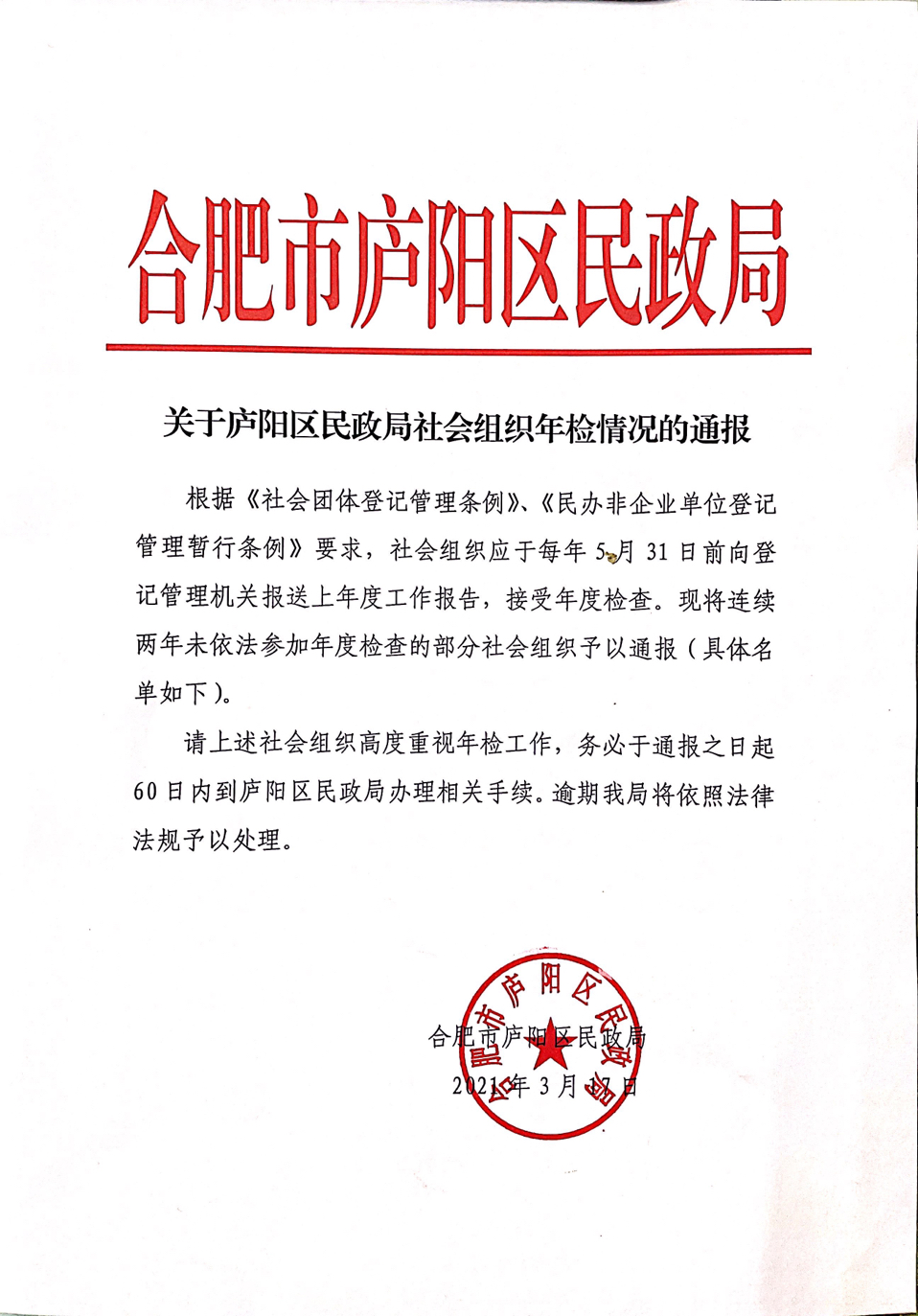 关于庐阳区民政局社会组织年检情况的通报