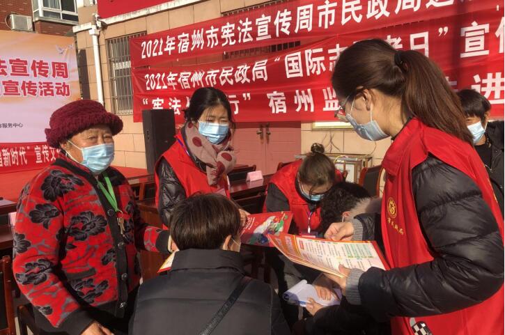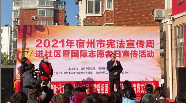 12月3日上午,在第36个国际志愿者日到来之际,我市隆重举“2021宿州市宪法宣传周进社区暨国际志愿者日宣传活动”在宿州市三里湾街道南方社区举行。