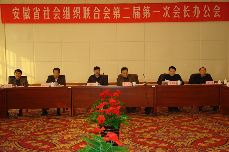 2011年12月19日下午,安徽省社会组织联合会(以下简称联合会)第二届第一次会长办公会在省警卫局召开。联合会名誉会长王佛生,联合会监事长张志轩,联合会副会长郭景斌、王 水、徐瑞成、何建国、王永凯、王泽华和副会长单位负责人王茂新,联合会副监事长张亚平、王南来和秘书长贾宝明等出席会议。联合会副秘书长和各分支、办事机构主要负责人等列席了会议。会议由联合会2011年度执行会长洪永平主持。