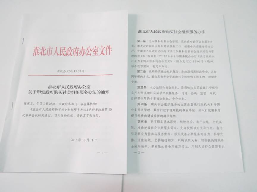 近日淮北市人民政府第10次常务会议研究出台《政府购买社会组织服务办法》,在淮北市基本建立比较完善的政府购买社会组织服务制度,形成与经济社会发展相适应、高效合理的公共服务资源配置体系和供给体系,公共服务水平和质量显著提高。