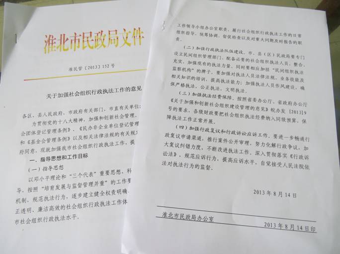 为贯彻党的十八大精神,加强和创新社会管理。根据《社会团体登记管理条例》、《民办非企业单位登记管理暂行条例》和《基金会管理条例》以及相关法律法规的有关规定,2013年8月14日经市政府同意,淮北市民政局制订出台了《关于加强社会组织行政执法工作的意见》(淮民管[2013]153号)。该《意见》重点包括四个方面的内容:一是确立了指导思想和工作目标;二是建立和完善制度、机制,推进行政执法体系建设;三是改进和创新执法行为,推进行政执法规范化建设;四是强化组织保障,提高执法监察实效。