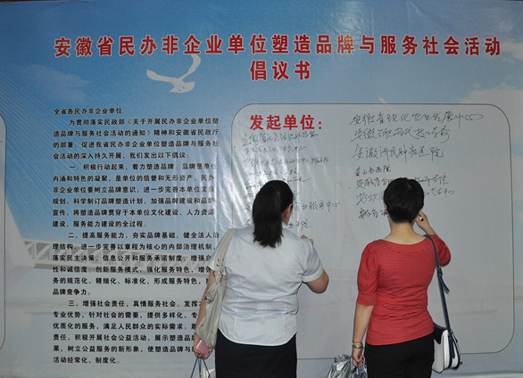 与会的民办非企业单位代表在《民办非企业单位塑造品牌与服务社会活动倡议书》宣传栏上郑重签名