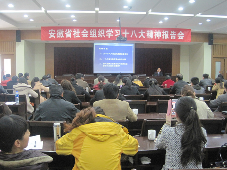近日,由省民间组织管理局、省社会组织联合会共同举办的安徽省社会组织学习十八大精神报告会在合肥顺利召开。省属社会组织负责人及专职工作人员240余人参加了会议。