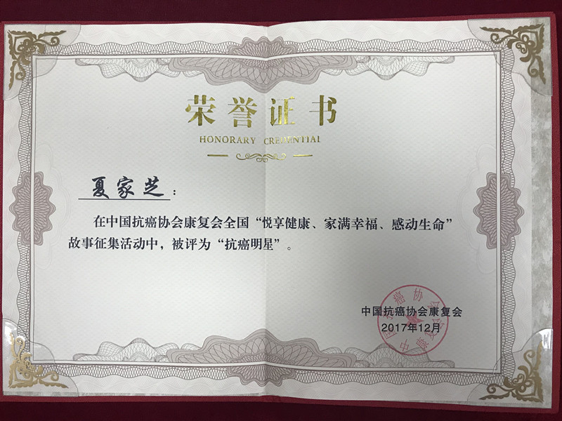 2017年12月,她被中国抗癌协会康复会评选为全国抗癌明星,受到表彰,成为全国几千万癌症患者学习的楷模。