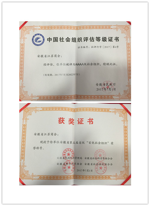 2016年11月,省级社会组织等级评估活动和第五届省级“百优社会组织”评选活动先后展开,通过社会组织自评、业务主管单位初评、材料审核、实地考察、评估委员会终审、公示等层层程序,严格选出结果。在评估过程中,安徽省民政厅、安徽省民间组织管理局等相关单位领导和评估委员会对江苏商会自身建设工作、专业服务水平和社会公信力等方面取得的成绩表示了高度肯定。