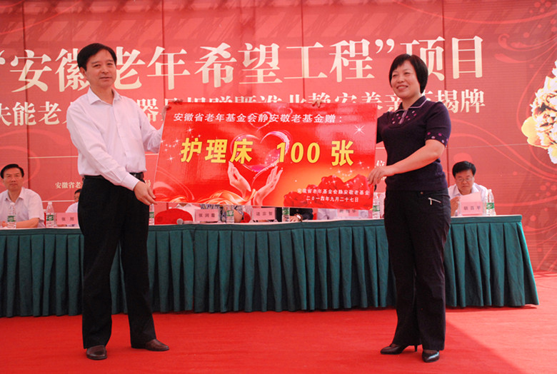 在九九重阳节到来之际,由安徽省老年基金会、淮北市民政局主办,安徽静安投资集团、烈山区民政局承办,淮北日报、淮北电视台协办的“安徽老年希望工程”项目----失能老人康护器具捐赠暨淮北静安养亲苑揭牌仪式于9月27上午,在淮北市举行。省老年基金会会长张润霞,省民政厅党组成员、省老龄办专职副主任张文达及相关单位领导和失能老人亲属代表数百人出席了活动仪式。
