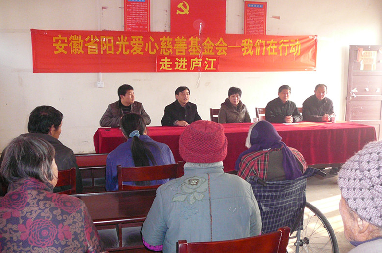 1月9日上午,安徽省阳光爱心慈善基金会“我们在行动——走进庐江”活动在同大镇新河村举行。安徽省阳光爱心慈善基金会会长、安徽德通投资管理有限公司总经理何卫祥先生一行,为同大镇新河村朱德仕等26户贫困家庭捐赠3万元扶贫济困资金。在这寒冷的冬天,在2013年春节即将来临之际,送来了社会的关爱,送来了人间的真情,使新河村老百姓倍感温暖,部分受捐群众流下了感激的眼泪。