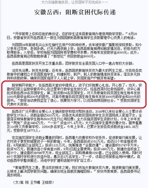 9ÔÂ15ÈÕ£¬¡¶¾¼ÃÈÕ±¨¡·ÔÚ16°æ¡°µ¹Í·Ìõ¡±Î»Öÿ¯·¢¡¶°²»ÕÔÀÎ÷£º×è¶ÏƶÀ§´ú¼Ê´«µÝ¡·£¬±¨µÀÔÀÎ÷ÏØ´óÁ¦ÊµÊ©½ÌÓý·öƶ£¬ÈÃÆ¶À§Ñ§×ÓÎÞÓdzɳ¤¡£