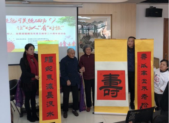 合肥市好人之家志愿者彭霞、孙琼等人在活动举办前夕,特地请爱心书法家为奶奶写上一副书法作品,做为生日礼物在活动现场送给奶奶,祝她身体健康,万事如意。同时爱心学生家长汪习宝说:“物类聚,人群分。我坚信,一个好人能带动身边人,一群好人就能带出“好人群”。我们会接过行善助人的接力棒,把张奶奶的大爱继续传递下去!”