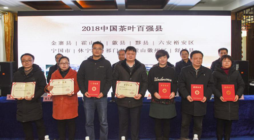 主办方还为金寨县、霍山县、歙县、黟县、休宁县、祁门县、宁国市等区县代为颁发了由中国茶叶流通协会评定的“2018 中国茶业百强县”证书。