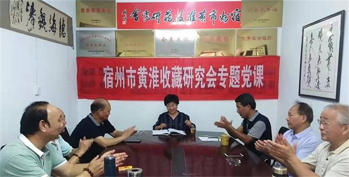 2019年8月3日,宿州市黄淮收藏研究会8月份会长办公例会暨专题党课活动在淮河路大花园会议室召开。宿州市财政局原副局长、调研员,本会新任党建指导员刘文英同志莅会指导并上专题党课。驻宿的研究会领导邢培林、金友超、林平、王广华、刘士勇、许学俭以及副秘书长郭忠华等参加会议。