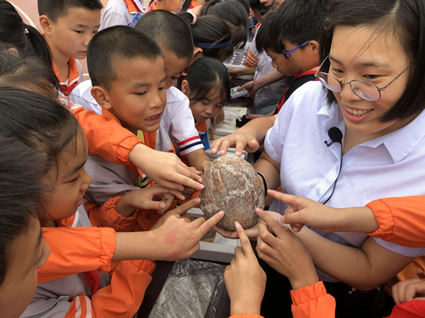 9月17日上午,金寨县斑竹园实验学校小学部的同学们触摸一亿多年前的恐龙蛋化石。