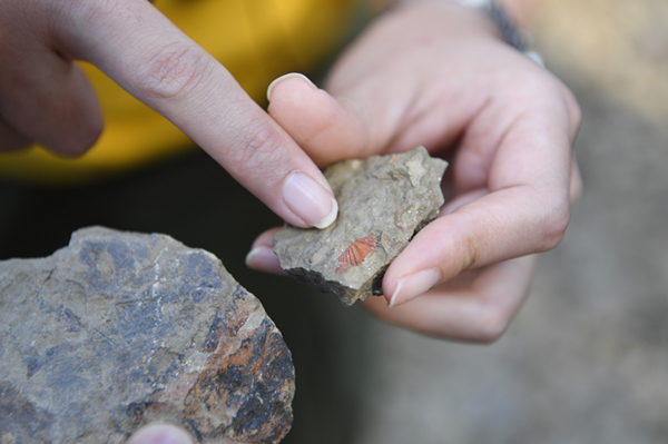 10月20日,在巢湖马家山-平顶山地区,省地质博物馆的志愿者正带领宿松县的贫困学子进行地质勘探,寻找古生物化石。