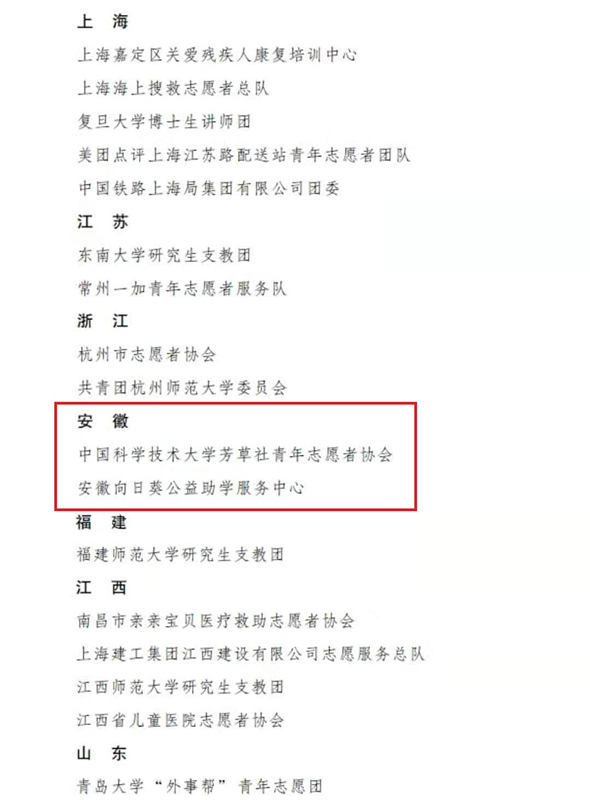 ½üÈÕ£¬µÚÊ®¶þ½ìÖйúÇàÄêÖ¾Ô¸ÕßÓÅÐã¸öÈ˽±¡¢×éÖ¯½±¡¢ÏîÄ¿½±Ãûµ¥½ÒÏþ£¬°²»ÕÏòÈÕ¿û¹«ÒæÖúѧ·þÎñÖÐÐĵÈÎÒÊ¡2¸öÖ¾Ô¸·þÎñ×éÖ¯»ñ¡°ÖйúÇàÄêÖ¾Ô¸ÕßÓÅÐã×éÖ¯½±¡±¡£´ËÍ⣬ÎÒÊ¡Íõî£Í¯¡¢ÆëÑǾüµÈ6ÈË»ñ¡°ÖйúÇàÄêÖ¾Ô¸ÕßÓÅÐã¸öÈ˽±¡±£¬Ñô¹âÌåÓý°®ÐÄÖ§½ÌÖ¾Ô¸·þÎñÏîÄ¿µÈ2¸öÏîÄ¿»ñ¡°ÖйúÇàÄêÖ¾Ô¸ÕßÓÅÐãÏîÄ¿½±¡±¡£