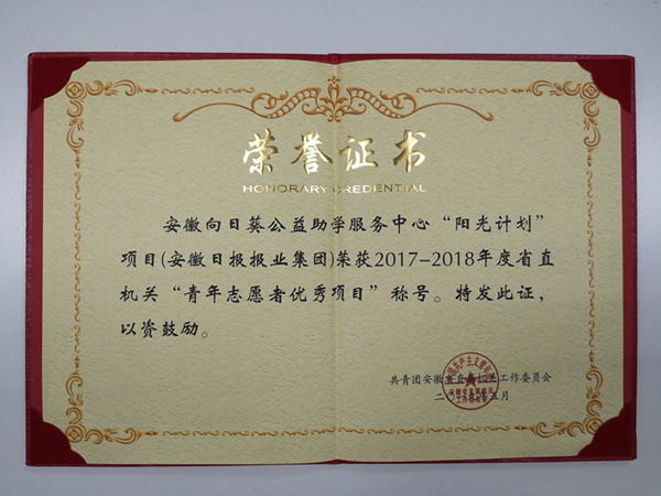 ¡ð 2019Äê5Ô£¬ÏòÈÕ¿û¡°Ñô¹â¼Æ»®¡±ÏîÄ¿±»ÆÀΪ°²»Õʡֱ»ú¹Ø¡°ÇàÄêÖ¾Ô¸ÕßÓÅÐãÏîÄ¿¡±¡£