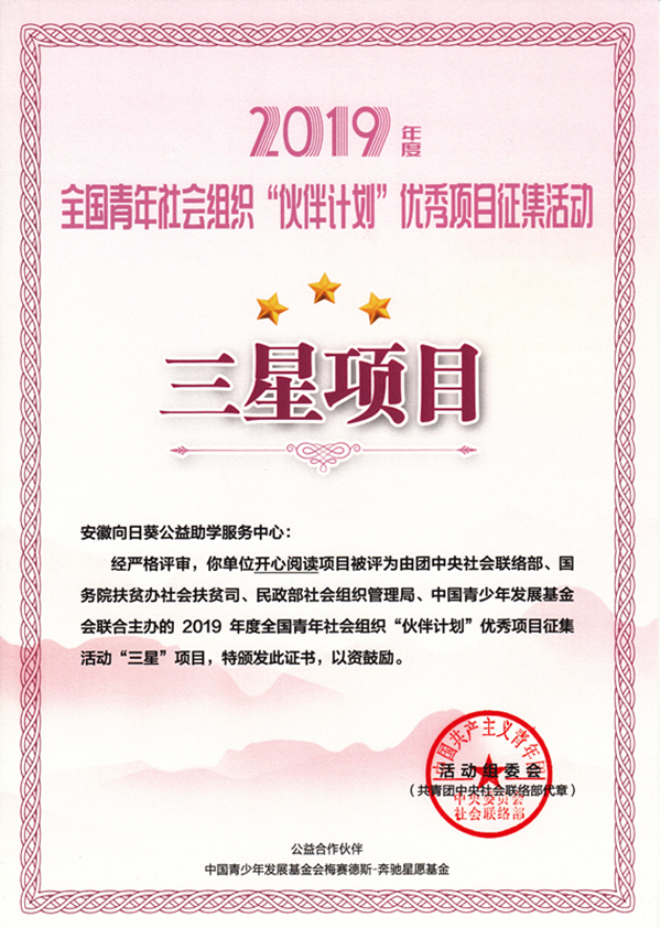 ¡ð 2019Äê10Ô£¬ÏòÈÕ¿û¡°¿ªÐÄÔĶÁ¡±ÏîÄ¿±»ÆÀΪÍÅÖÐÑë2019Äê¶È¡°»ï°é¼Æ»®¡±ÈýÐÇÏîÄ¿¡£