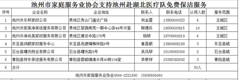 为向奋战在治疗防控一线的英雄致敬,进一步助力驰援疫情防控工作,池州家庭服务业协会联合党支部、池州家庭服务业协会、池州市家庭服务行业工会联合会、池州市家庭服务业妇女联合会经与池州市卫生健康委员会联系,决定为全市30名援鄂医护人员在2020年度免费提供一次家庭保洁服务。号召全市家政行业企业踊跃认领服务项目,积极向援鄂医护人员献爱心,鼓励大家自主自发开展“致敬白衣池军,为英雄服务”活动。