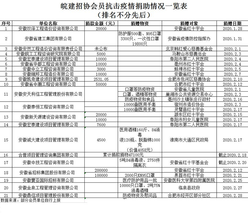 自疫情发生以来,安徽省建筑工程招标投标协会广大会员纷纷响应协会号召,积极履行社会责任,踊跃捐款捐物,充分体现了我省建设工程招标投标行业大爱无疆,群策群力,众志成城的磅礴力量。截止2020年3月1日,据不完全汇总,我会会员单位共计捐款50余万元,同时还捐赠了大批口罩、消毒液等防疫物资和生活用品。