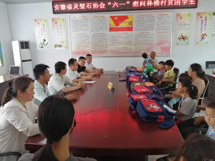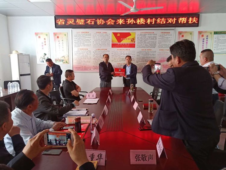 2020年5月12日, 安徽省灵璧石协会赴埇桥区栏杆镇孙楼村开展扶贫捐赠活动。省灵璧石协会会长黄国强, 栏杆镇委书记史云, 埇桥区民政局副局长段殷, 埇桥区社会组织管理局局长李军等人出席捐赠活动。产业帮扶方面,与该村签订战略合作协议, 为村积极销售苗圃, 支持村经济发展。教育扶贫方面,向该村学生捐赠1万元助学资金, 以期顺利完成学业, 早日成为国家栋梁之才。文化帮扶方面,向该村捐赠宿州书画名家郭大华、陈晓辉、郭峰、张超、蔡胡等人书画作品和张训彩书籍, 旨在繁荣群众文化生活。健康扶贫方面,向该村捐赠价值8800元的净水系统一台, 捐赠价值5万元的健康体检卡, 旨在提高群众生活水平。公益扶贫方面,向该村贫困户捐赠米面油等生活物资, 旨在改善群众生活质量。