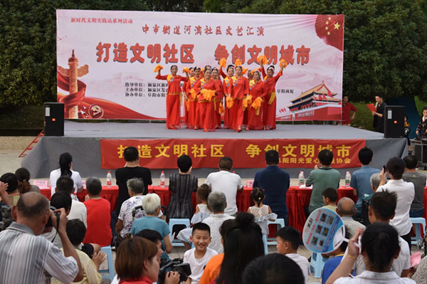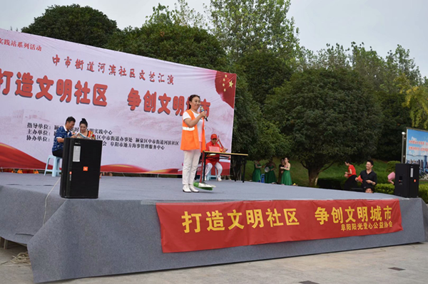 8月5日下午,安徽省阜阳市颍泉区中市街道河滨社区联合阜阳阳光爱心公益协会艺术团,在社区文化广场举办“新时代文明实践站系列活动——打造文明社区 争创文明城市”文艺演出,演员们用舞蹈、歌曲、戏曲、小品、情景剧、沙克斯演奏等形式展示新时代风貌,广大市民在寓教于乐、轻松氛围中接受教育。与此同时,阜阳市爱心演艺协会和颍泉区三里社区也在社区文化广场举办“携手共建文明城 同心共筑中国梦”主题活动。(陆宏晓)