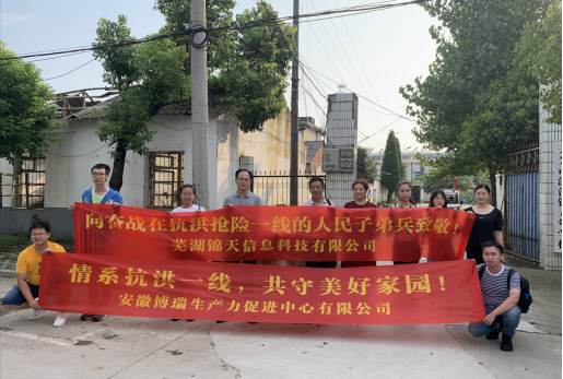 为全力支持一线防汛抗洪,安徽省春晓生产力促进中心先后三次组织公司职工,积极筹集防汛物资,为奋战在防汛抢险一线的党员干部、抗洪战士、受灾群众送去一份温暖和关爱。7月14日分别赶赴经开区龙山街道防汛抗旱指挥所、弋江区中南街道和南瑞街道防汛抗洪指挥所、鸠江区二坝镇防汛抗旱指挥部等抗洪一线,为坚守岗位的防汛值班人员送去急需的方便面、矿泉水、火腿肠等物资;7月23日采购铁锹、雨衣等物资前往无为市牛埠镇进行慰问;7月27日采购抗洪物资支援无为市红庙镇、鸠江区沈巷镇等防汛一线。