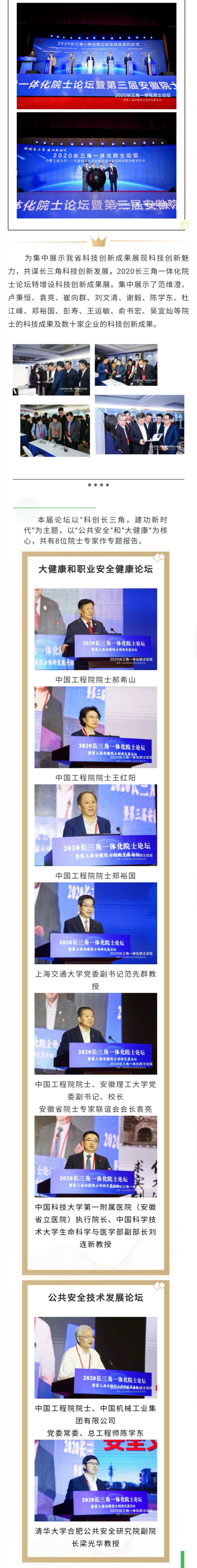11月7日,以“科创长三角 建功新时代”为主题,由中国科协指导,安徽省科协、上海市科协、江苏省科协、浙江省科协、中国科学技术大学、安徽理工大学、中国科学院合肥物质科学研究院、中国工程科技发展战略安徽研究院等主办,安徽省院士专家联谊会、中科大附属第一医院、安徽理工大学环境友好材料与职业健康研究院(芜湖)、安徽理工大学高等研究院(合肥)、清华大学合肥公共安全研究院、安徽省科学家企业家协会承办的2020长三角一体化院士论坛暨第三届安徽院士创新发展论坛在合肥稻香楼宾馆举办。安徽省委常委、常务副省长邓向阳出席论坛开幕式并致辞,安徽省政协副主席、省科协主席韩军,安徽省政协原副主席王鹤龄,省政府副秘书长李必方,省科技厅厅长罗平,中国工程院和中国科学院院士常印佛,中国工程院院士、安徽理工大学党委副书记、校长、安徽省院士专家联谊会会长袁亮,龚知本、郭光灿、郝希山、张裕恒、王红阳、崔向群、郑裕国、杨善林、赵政国、谢毅、李建刚、陈学东、王运敏、方家熊等24位中国科学院和中国工程院院士,合肥市委常委、常务副市长罗云峰,中国科学院合肥物质科学研究院原副院长、安徽省政府参事江海河,江苏省科协党组书记、副主席孙春雷,上海市科协党组成员、二级巡视员黄兴华,浙江省科协党组成员、秘书长谢牧人,安徽省科协党组书记、专职副主席王洵,安徽省科协副主席魏军锋、方勇华,中国科学院合肥物质科学研究院院长刘建国,合肥工业大学校长梁樑,清华大学合肥公共安全研究院执行院长袁宏永及有关高校、科研机构负责人、专家学者等共450人参加会议,开幕式由安徽省科协党组书记、专职副主席王洵主持。