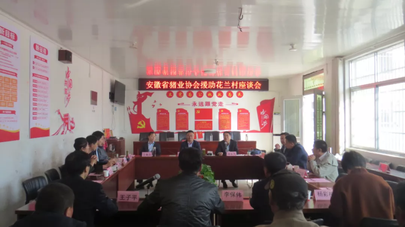 阜阳市农业农村局副局长王朝良、省猪业协会会长、安徽安泰农业集团董事长杨勇、省猪业协会副会长兼秘长书李东风、协会副会长安徽华杰农牧科技有限公司董事长王家法、安徽浩翔农牧公司董事长高亚飞、正大集团安徽区助理副总裁高章国、砀山兴达良种猪养殖公司董事长王淑芹、安徽省六兴生态养殖有限公司总经理严卫国、阜阳快乐农牧科技有限公司总经理赵勇、以及花兰村支部书记李长久、第一书记王子平等相关乡镇负责人参加了本次座谈会。