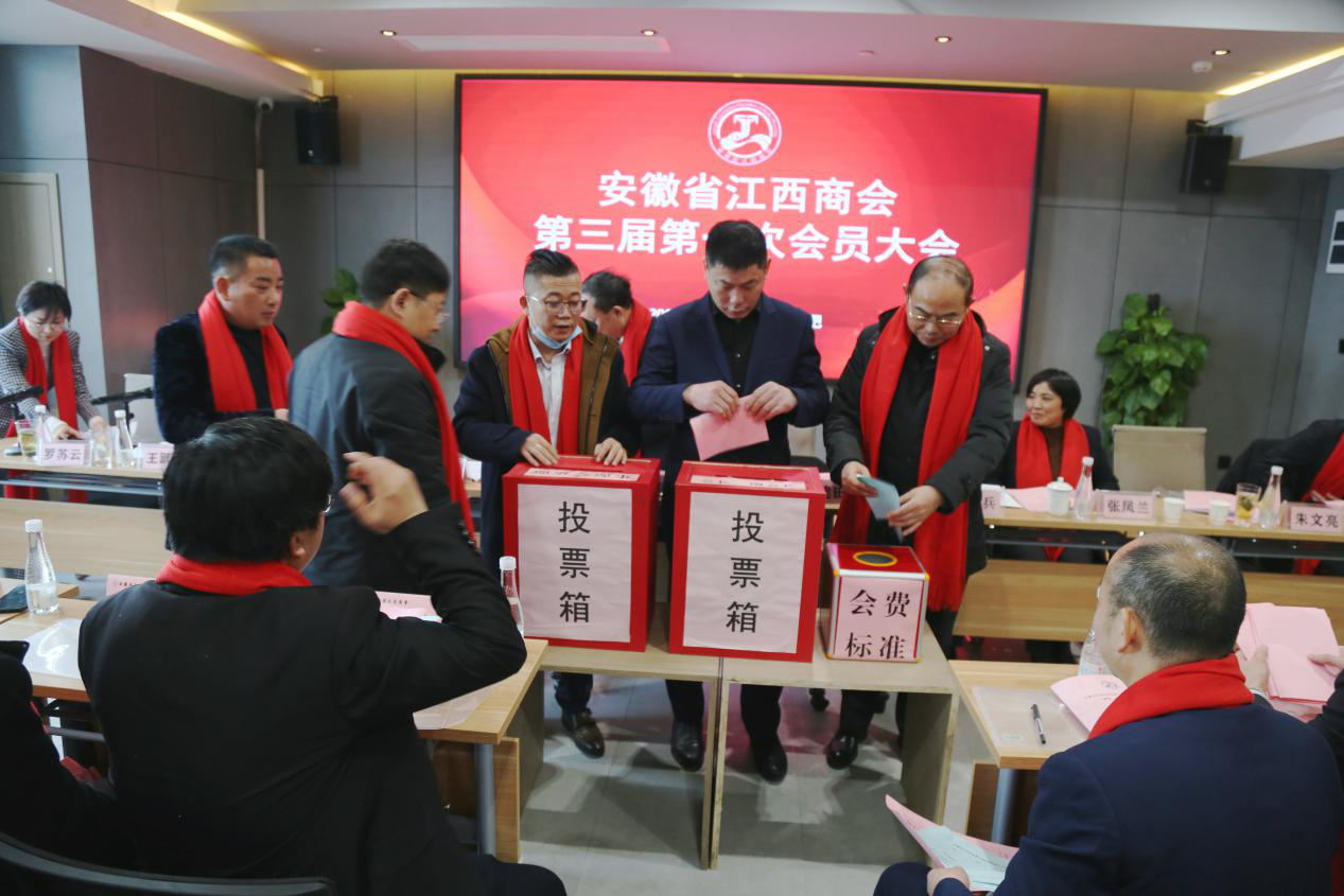 大会表决通过了《安徽省江西商会第二届理事会财务审计情况报告》,《安徽省江西商会章程修改情况说明》、《安徽省江西商会第三届会员大会选举办法》;无记名投票表决通过了会费标准。大会通过无记名投票,选举产生了安徽省江西商会第三届理事会及新一届理事会领导班子成员。当监票人宣布杨建田当选为第三届理事会会长时,全场报以热烈的掌声表示祝贺。
