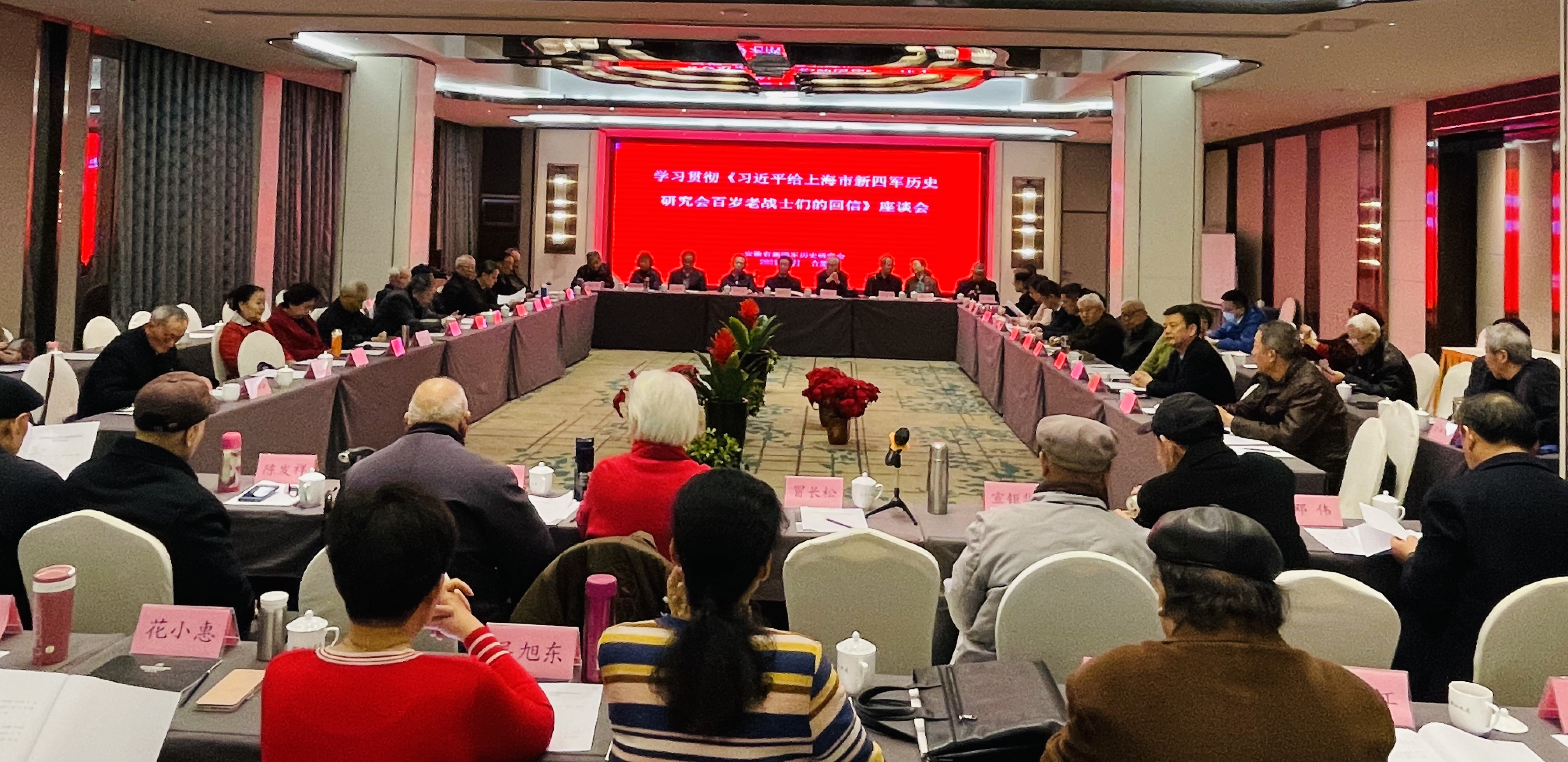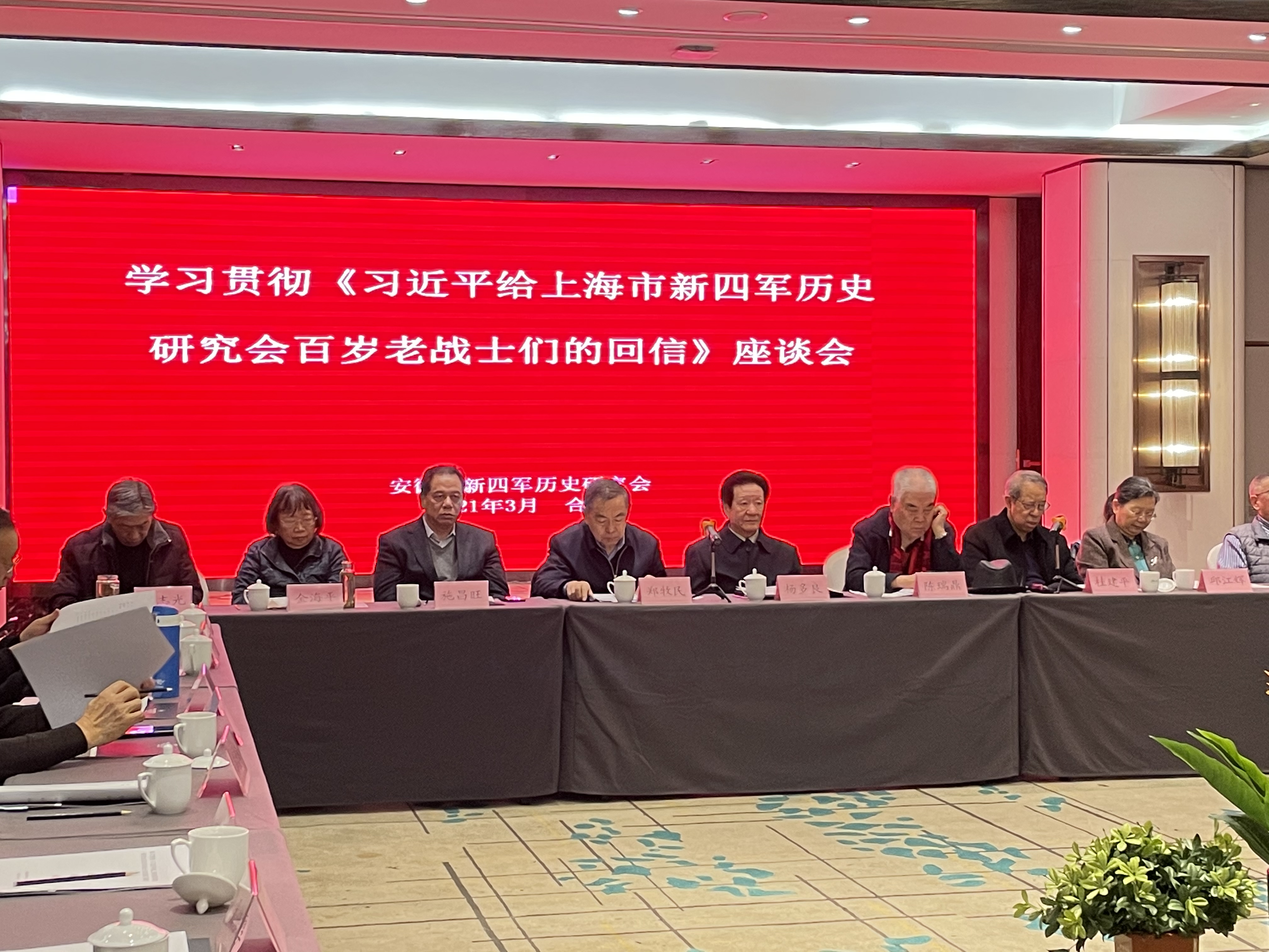 3月1日,安徽省新四军历史研究会在合肥召开“学习贯彻《习近平给上海市新四军历史研究会百岁老战士们的回信》精神座谈会”。省新四军历史研究会原会长、省政协原主席杨多良,省新四军历史研究会顾问、省人大常委会原副主任陈瑞鼎出席会议。省新四军历史研究会会长、省政协原副主席郑牧民到会讲话。部分在肥的新四军老战士、省新四军历史研究会理事和党史军史工作者,共60人参加座谈会。