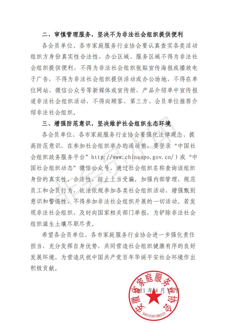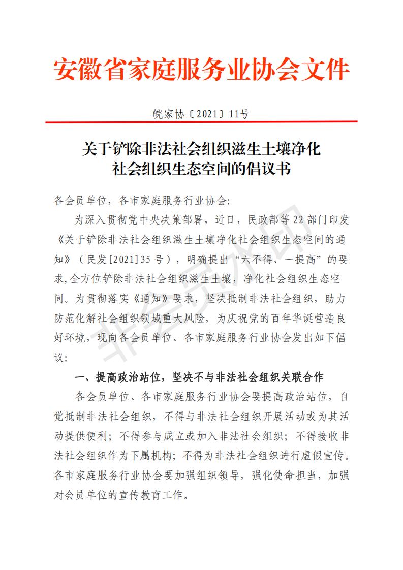 安徽省家庭服务业协会关于铲除非法社会组织滋生土壤净化 社会组织生态空间的倡议书