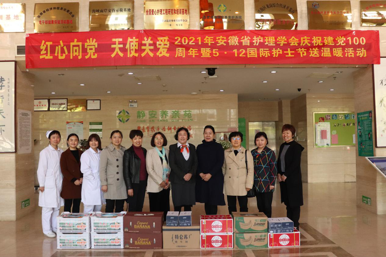 2021年4月10日,中共安徽省护理学会党委在武义华书记的带领下,赴安徽静安养亲苑开展庆祝建党100周年暨5.12护士节送温暖活动,本次活动主题为“红心向党·天使关爱”。中共安徽省护理学会党委给孤寡老人们送去食品等其它物资。
