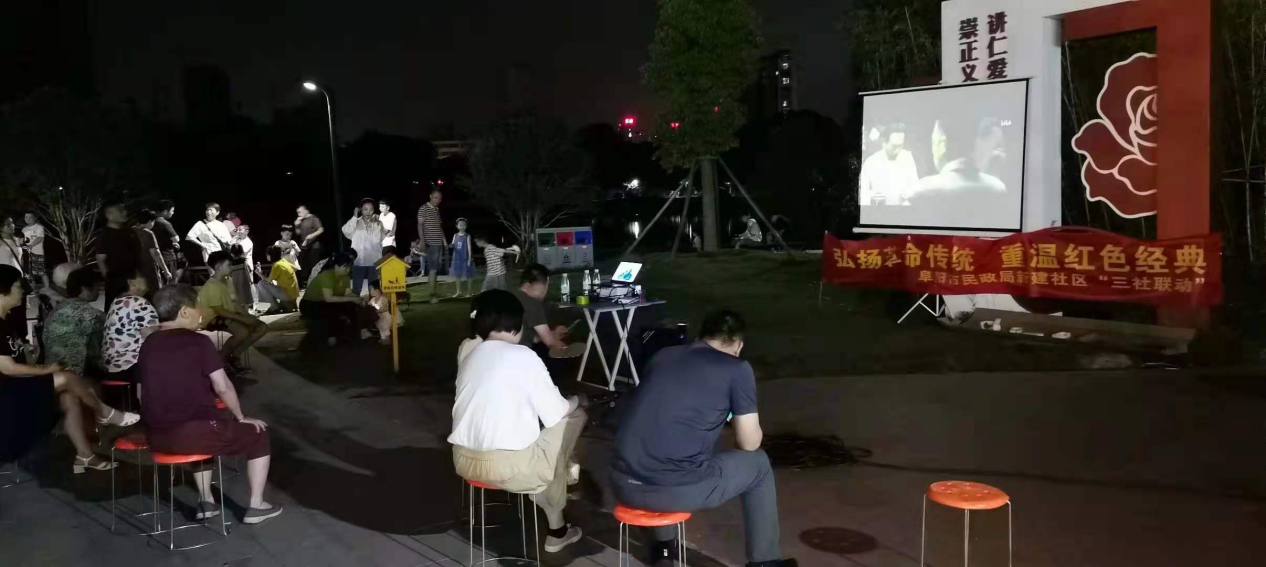 为庆祝建党100周年,弘扬革命传统,重温红色经典。阜阳市“三社联动”新建社区试点项目,在阜阳市民政局指导下,阜阳阳光爱心公益协会联合新建社区居委会,于7月1日晚,在慧湖广场放映了红色电影《建党伟业》。通过观影,教育青少年儿童和社区居民;中国共产党一百年的历程,一百年的艰辛,无数革命志士,在昔日的枪林弹雨中,用坚定的信念,为我们打下了一片江山。今天的“七一”——党的生日,我们要牢记党的恩情,坚定党的信念,沿着党给群众铺铸的这条幸福之路前行。