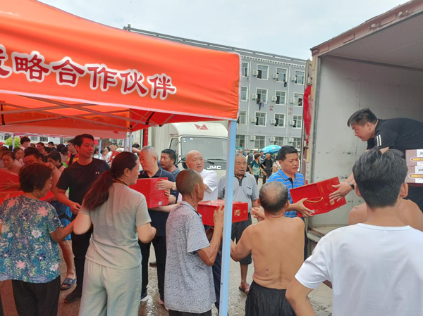 经过几天的紧张筹措,星夜兼程,辗转奔波,救灾物资全部到位。2021年7月27日上午,商会会长丁红伟一行将包括馒头、鸭蛋、八宝粥、火腿肠、牛奶、帐篷、睡垫、迷彩服等物品物资送往扶沟县安置点。扶沟县委办、县红十字会接受捐赠物资。