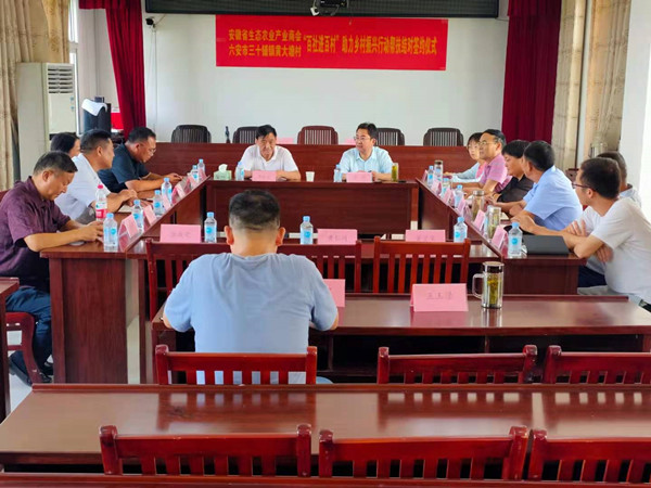 8月18日下午,安徽省生态农业产业商会与六安市金安区三十铺镇黄大塘村举行乡村振兴帮扶共建签约仪式。六安市金安区三十铺镇党委书记项阳、黄大塘村选派干部杨进、村党支部书记董家如、村委会主任程远柱,商会名誉会长华应明、执行会长姜平、常务副会长汪家玲、秘书长王章潮等出席签约仪式。