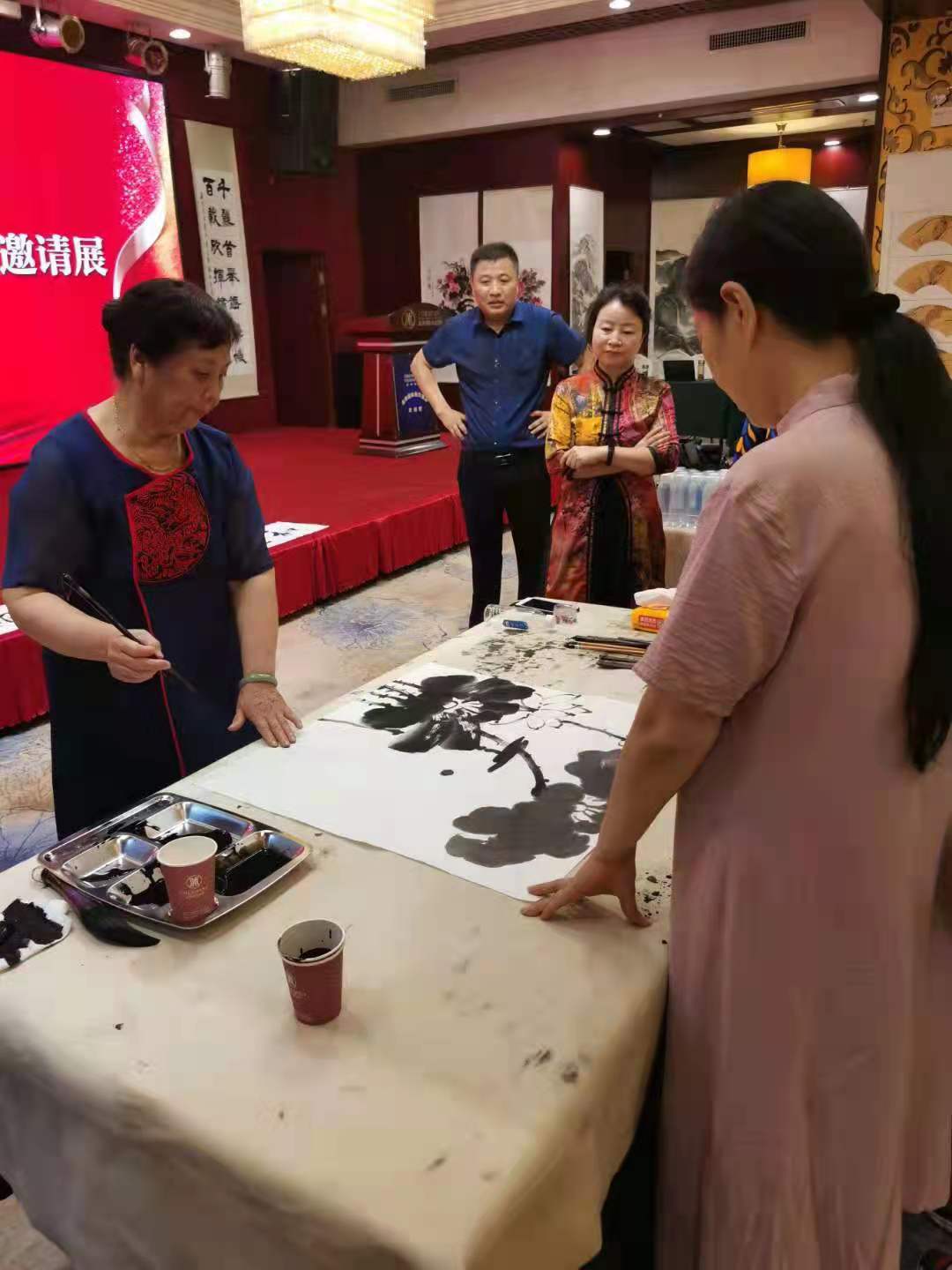 展览现场,三位女书画艺术家杨兴玲、杨华、韦明升挥毫泼墨,创作展示一幅幅具有鲜明的政治性、广泛的群众性和精湛的艺术性的作品。