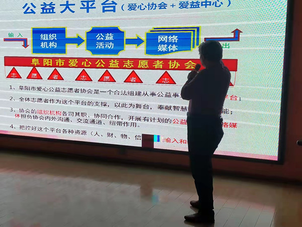 本次志愿者培训是按照协会的统筹安排,协会顾问潘晓南老师事先作了充分准备,他用自己参与志愿服务多年来收集的素材,以“阜阳市爱心公益志愿者协会”这个名称、这个公益平台及主要功能为课纲,把培训的内容通过PPT展示,并负责主导讲解。把爱心公益、志愿者、社团组织的内涵与协会的起航、发展、提升联结在一起;把协会公益平台的搭建、支撑、职能、维护与志愿者“奉献、友爱、互助、进步”精神以及协会优秀志愿者的爱心故事,串结在一起讲解;按讲解进程和内容与参加培训的志愿者进行互动,提升参训人员的关注度,激发参训人员的热情;在讲述的适当环节插入了协会文艺骨干人员的演唱《爱的奉献》及诗朗诵《我骄傲,我是爱心志愿者》等表演。电子屏展示的画面及内容让人耳目一新,讲述的内容与协会、志愿者都紧密相连,互动时亲切、真情流露。潘晓南老师为参培人员捧上一份提升志愿服务知识的大餐,通过交流互动环节,又将学习中和日常工作中碰到的疑惑得到破解,细致入微的讲解、幽默恢谐的回答与交流,让整个培训会现场掌声和欢笑不断,洋溢着欢快轻松的氛围。