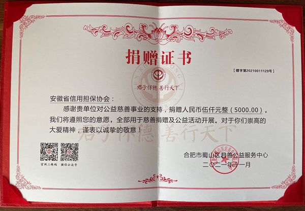 11月29日,安徽省信用担保协会向合肥市蜀山区君善公益服务中心捐赠善款5000元,传播爱心,传递正能量。