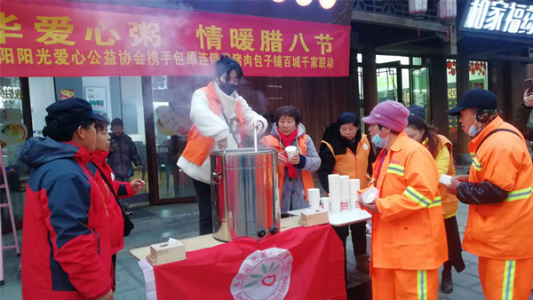 阜阳阳光爱心公益协会活动主题是“中华爱心粥 情暖腊八节”关爱阜阳环卫工人及市民的文明实践志愿服务。该协会组织50多名志愿者,分组深入周边街区广场和“爱心商家”共计8个站点,为身边辛勤奋斗在工作一线的几百名环卫工人送去腊八粥、油条、鸡蛋、包子等早餐食食品。