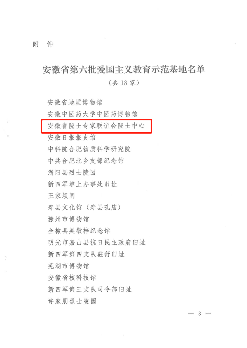 ½üÆÚ£¬Öй²°²»Õʡί°ì¹«Ìü °²»ÕÊ¡ÈËÃñÕþ¸®°ì¹«ÌüÁªºÏÏ·¢¡¶¹ØÓÚÃüÃû°²»ÕÊ¡µÚÁùÅú°®¹úÖ÷Òå½ÌÓýʾ·¶»ùµØµÄ֪ͨ¡·£¬ÆäÖа²»ÕʡԺʿר¼ÒÁªÒê»áԺʿÖÐÐÄÈëÑ¡¡£