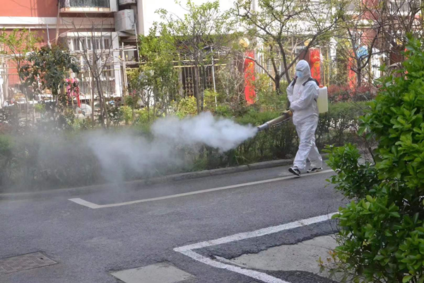 河滨社区位于老城区,管辖范围内的小区建筑物复杂,人员密集、人流量大,为给小区居民营造一种干净安全的生活环境,社区在书记汪琴副书记严纯芝的带领下,工作人员联合防疫消杀队,对辖区范围内住宅区进行全覆盖、不间断的喷洒消毒工作,确保没有卫生死角,阻断病毒传播途径。