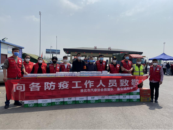 淮北汽摩协会救援队,淮北越野家族俱乐部,向淮北五个主要疫情防控卡点防疫工作人员,捐赠纯净水、方便面、火腿肠、医用口罩、酒精消毒液等物资,合计价值一万五千多元。五个防疫站点合计出动车次二十多辆,捐赠人员合计50多名。