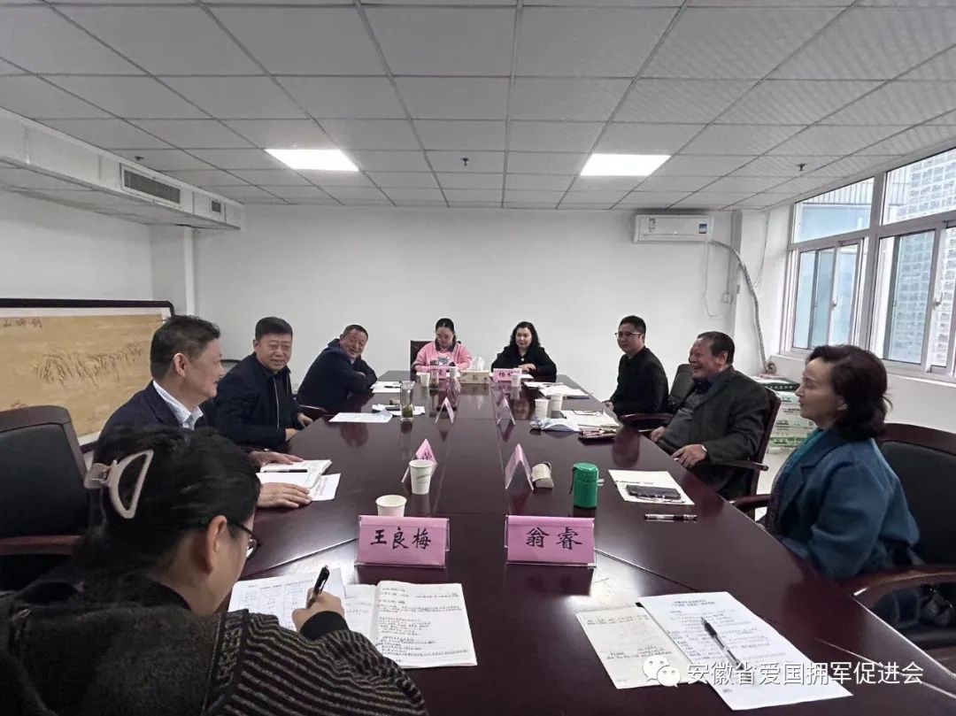 近日,安徽省社会组织总会监事会副监事长李永胜、评估中心主任夏惠芬、监事办副主任沈运斌一行前往安徽省爱国拥军促进会走访调研,省爱国拥军促进会会长蔡元和、秘书长洪斌等热烈欢迎调研组一行,双方就近期工作开展情况进行交流座谈。