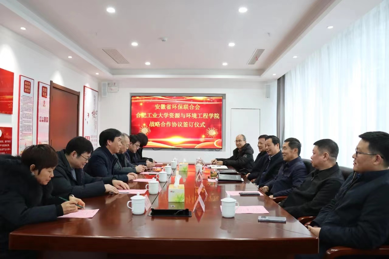 2024年1月22日,安徽省环保联合会与合肥工业大学资源与环境工程学院在合肥签订战略合作协议。安徽省环保联合会主席张杰、常务副主席刘定明、副主席李江海、副主席兼秘书长贾宏群、副主席张友德,合肥工业大学资源与环境工程学院党委书记南国君、院长袁峰、副院长崔康平等出席签约仪式。